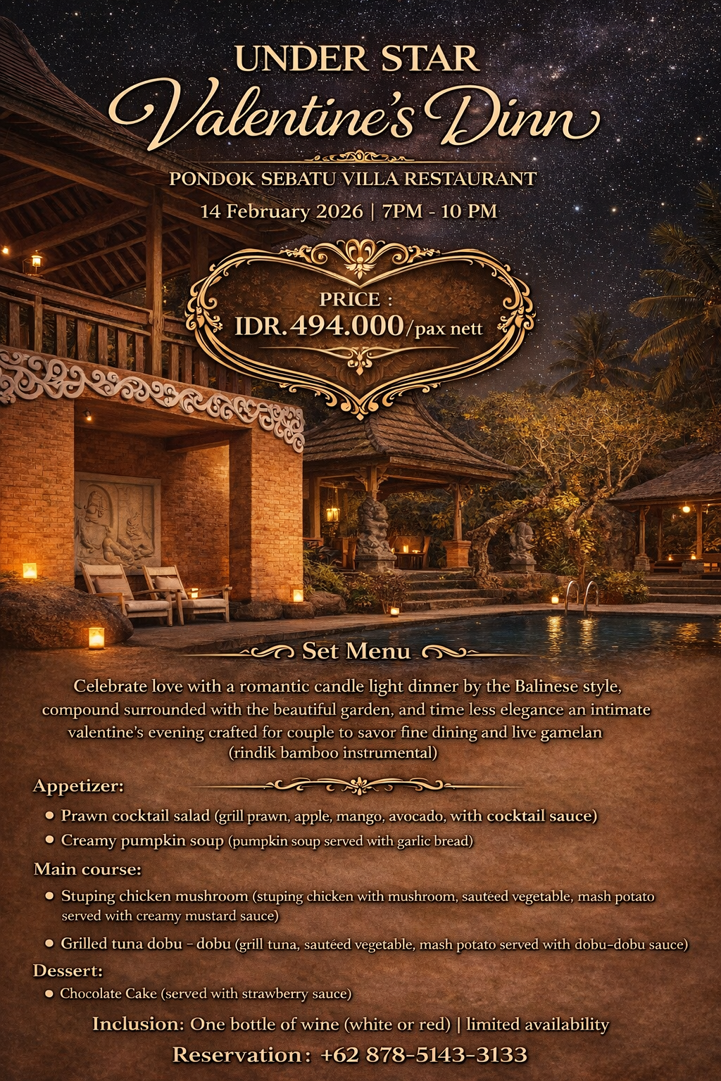 Built in the middle of rice paddy facing to the amazing valley of rice terrace in the traditional Balinese Village Sebatu Tegallalang, Pondok Sebatu Villas offering a selection of unique wooden style villa with nature environment. With only 20 minutes drives from the center of Balinese Culture Village of Ubud, passing through the famous Tegalalang rice terrace made Pondok Sebatu a perfect place for honeymoon and gateway from a hustle bustle of the city. The location also only 15 minutes to the famous tourist attraction of Kintamani volcano, Tampaksiring Temple and a collections of ancient Balinese temple, a collection of coffee plantation spot that spread out surrounding the area.